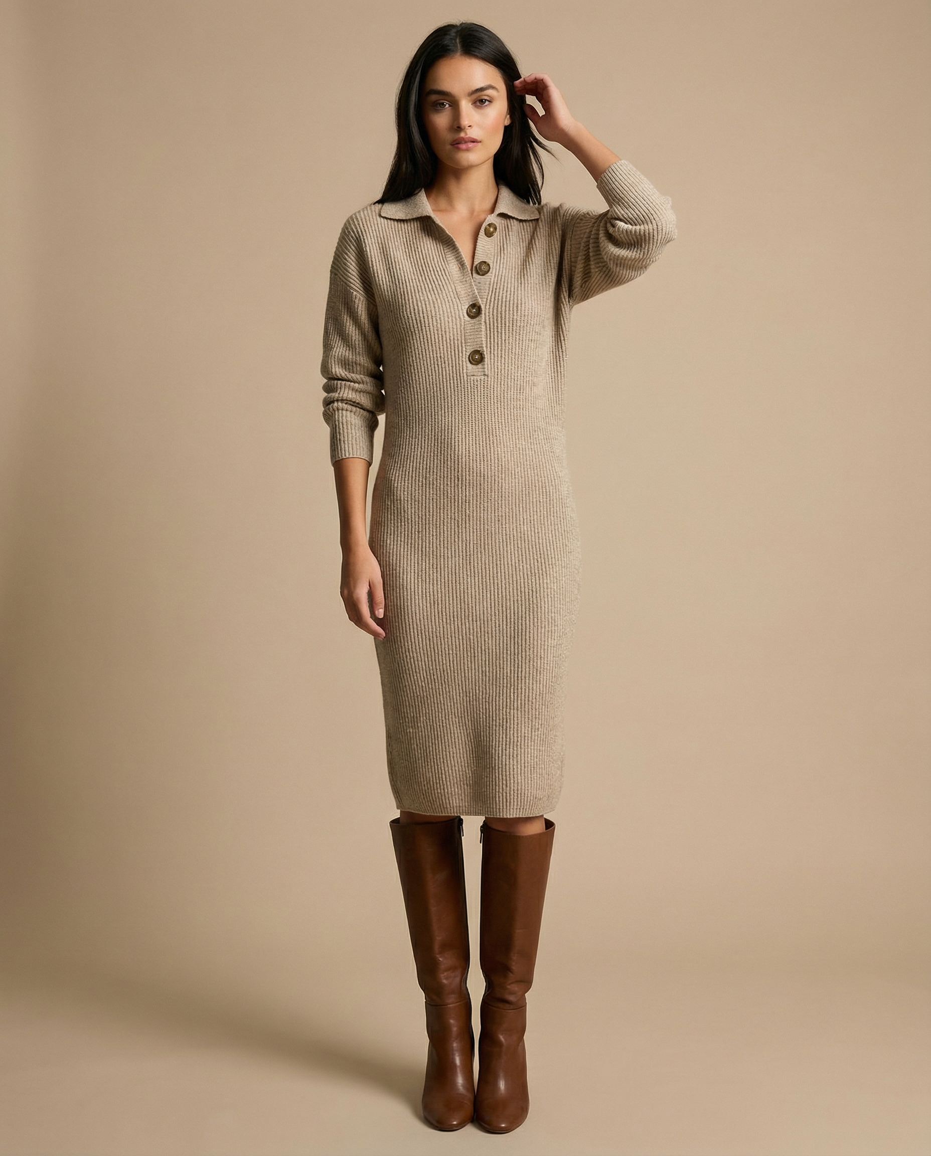 The Janice | Elegant Sweater Dress blends cosy comfort with refined sophistication — crafted for women who value effortless elegance every day. Made from a soft ribbed knit with a relaxed, flattering silhouette and a polished button-down collar, this dress offers warmth, movement, and timeless femininity. Whether styled with boots for daytime ease or with heels for evening charm, the Janice is designed to help you feel confident, comfortable, and beautifully put-together.