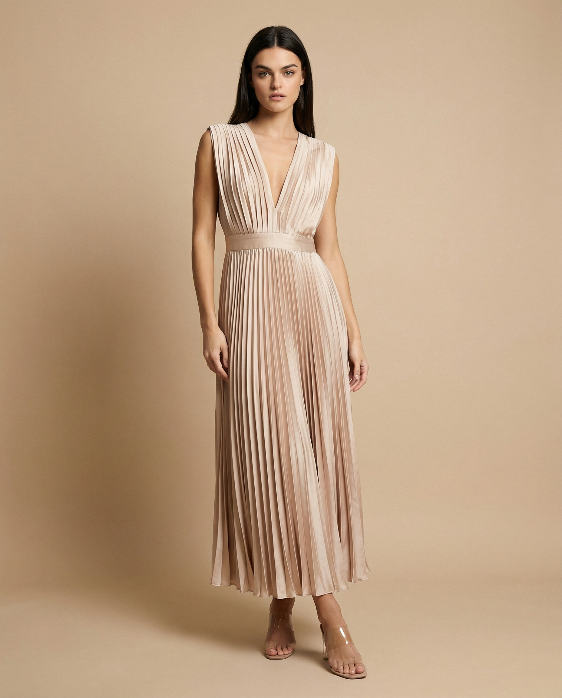 The Mae | Elegant Dress blends timeless beauty with effortless sophistication. Crafted from luxurious pleated fabric, it flatters the silhouette with a deep V-neckline and cinched waist, flowing gracefully with every step. Perfect for romantic dates, stylish gatherings, and elegant weddings — Mae ensures you feel confident, feminine, and unforgettable.